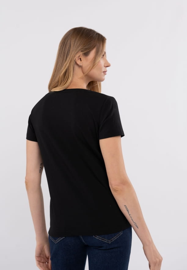 Cechy dodatkowe: elastyczny, miękki materiał; geometryczny napis na piersi; półokrągły dekolt wzmocniony ściągaczem